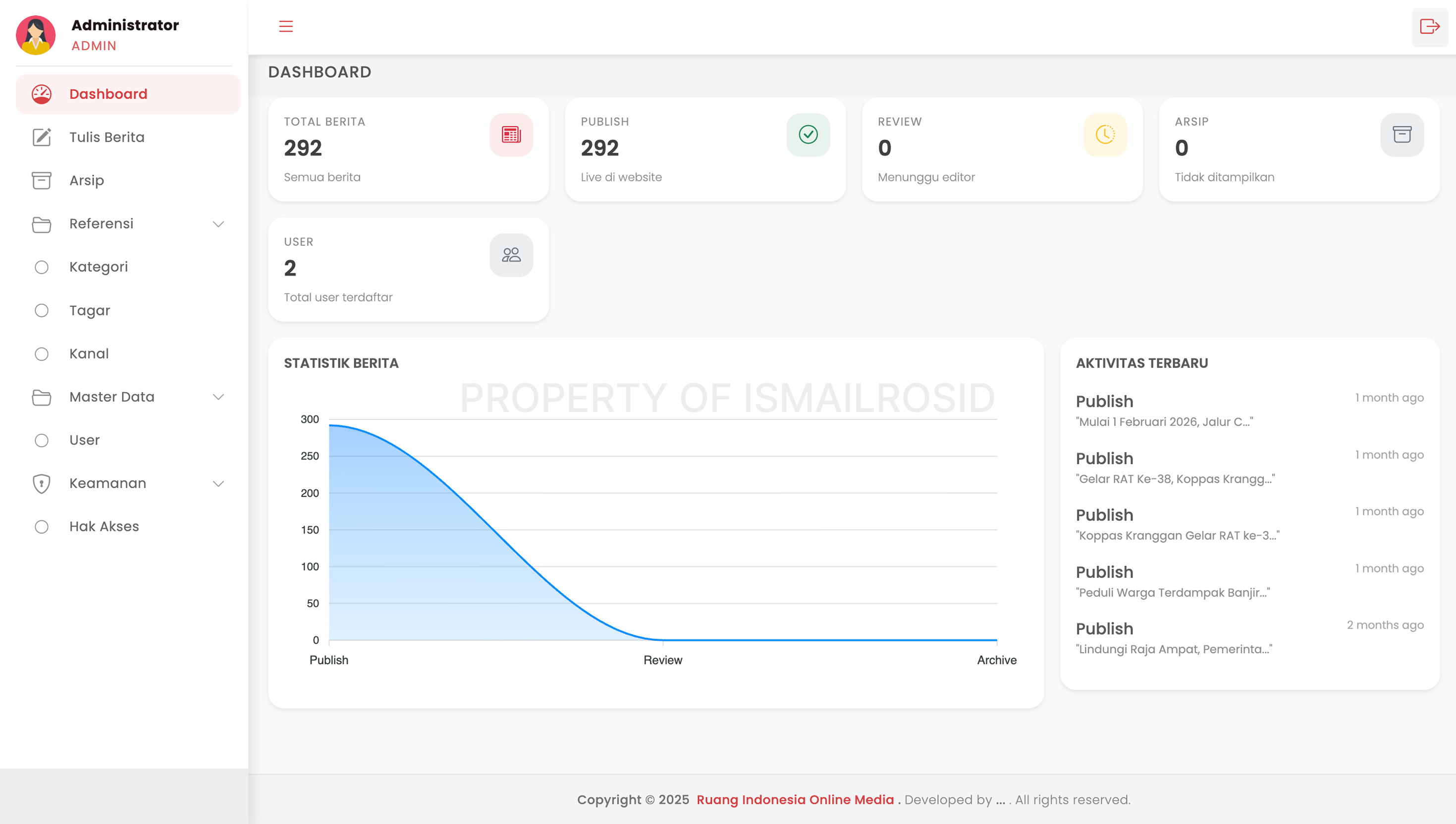 CMS (Content Management System) adalah aplikasi berbasis web yang digunakan untuk mengelola konten berita secara digital. Sistem ini menyediakan fitur penulisan dan publikasi berita, pengelolaan arsip, serta manajemen konten yang terstruktur melalui dashboard admin. Fitur utama meliputi Dashboard statistik, Tulis Berita, Arsip konten, Referensi data, serta pengelolaan Kategori, Tagar, dan Kanal berita. Selain itu, sistem juga dilengkapi dengan modul Keamanan, Hak Akses, Master Data, dan manajemen User untuk mengatur kontrol sistem secara menyeluruh. Dengan adanya fitur tersebut, CMS ini membantu proses pengelolaan konten menjadi lebih efisien, terorganisir, dan mudah digunakan dalam skala aplikasi nyata.