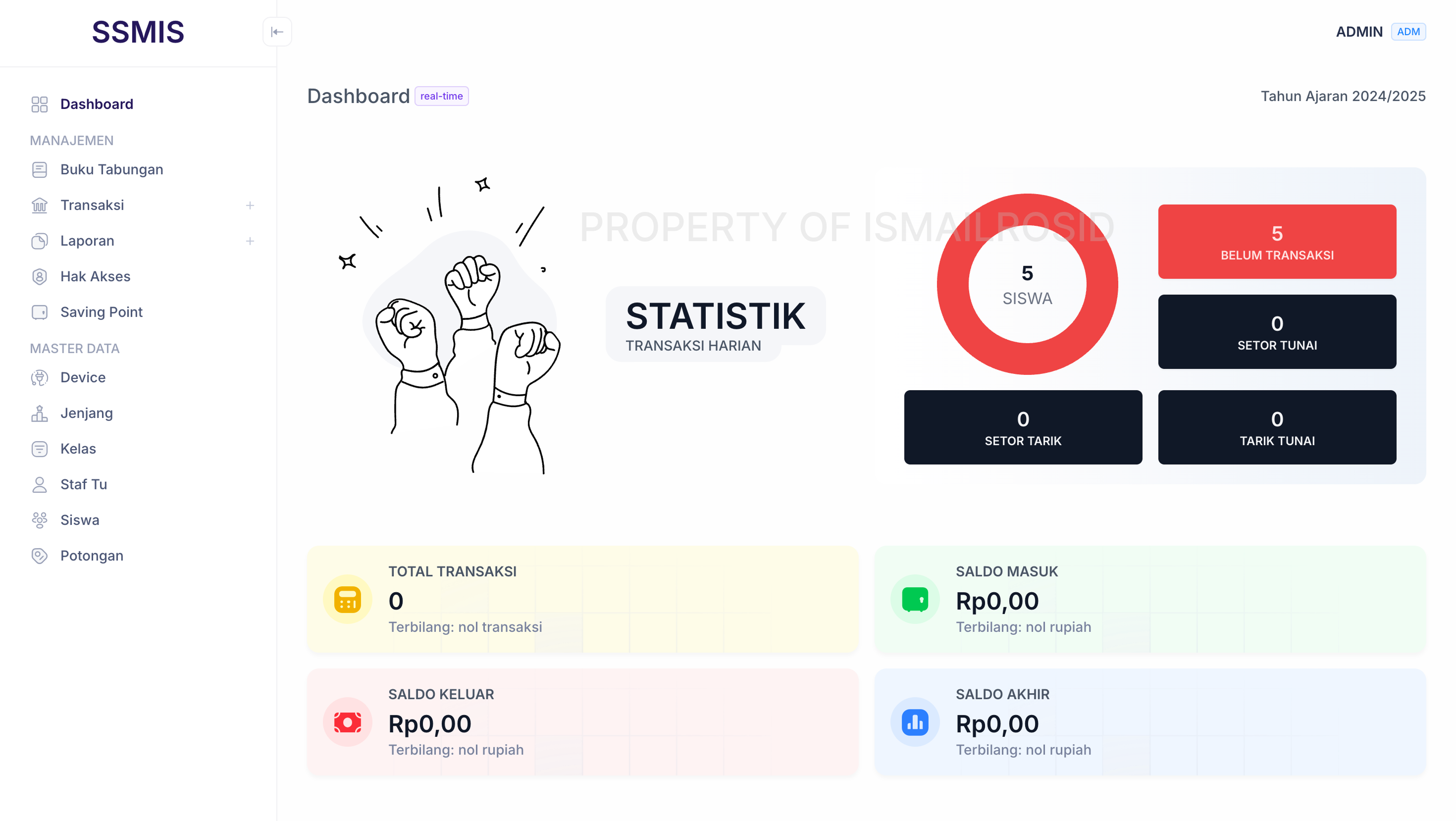 SSMIS (Student Saving Management Information System) adalah aplikasi berbasis web untuk mengelola tabungan siswa secara digital dan terintegrasi. Sistem ini menyediakan fitur transaksi seperti setor dan tarik tunai, pencatatan otomatis, serta monitoring saldo secara real-time yang dapat diakses oleh pihak sekolah dan orang tua. Dilengkapi dengan dashboard statistik interaktif, rekap transaksi harian, buku besar, serta laporan keuangan yang terstruktur, sistem ini membantu proses administrasi menjadi lebih efisien dan akurat. Data juga dapat diekspor dalam format PDF, Excel, dan CSV untuk kebutuhan pelaporan. SSMIS terintegrasi dengan perangkat Smart Saving untuk mendukung otomatisasi transaksi, sehingga meningkatkan transparansi, efisiensi, dan keandalan dalam pengelolaan tabungan siswa.